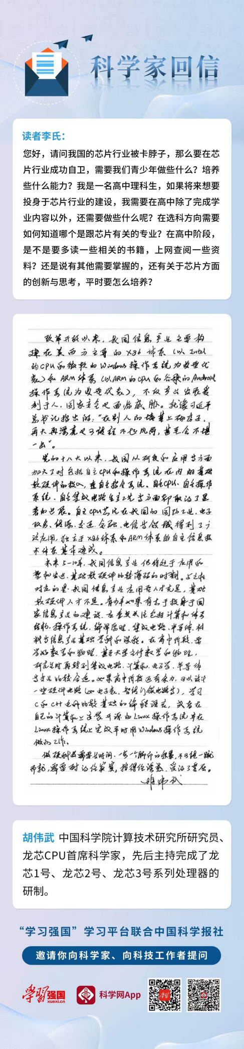 科普不止于知识普及,更是信念传递。面对高中理科生关于“青少年想投身芯片行业该培养哪些能力”的提问,龙芯中科董事长胡伟武在“学习强国”学习平台——《科学家回信》栏目中给予回复:青少年如果有志于投身于国家信息产业的建设,应重点关注包括计算机体系结构、操作系统、编译原理、集成电路、半导体、材料等信息产业基础学科的课程。在高中阶段,要学好数学和物理,甚至大学主修数学和物理,研究生时再转到集成电路、计算机、电子学、半导体等专业比较合适。