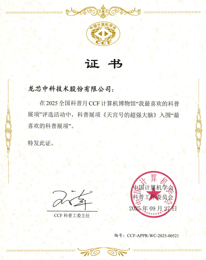 龙芯中科积极践行企业社会责任,持续开办、支持科普活动。2025年全国科普月期间,由龙芯团队设计的《天宫号的超强大脑》科普展项成功入围CCF全国科普月重点活动“CCF计算机博物馆我最喜欢的科普展项”评选,将航天工程中芯片的特殊设计及工作原理转化为可触可感的科普体验。